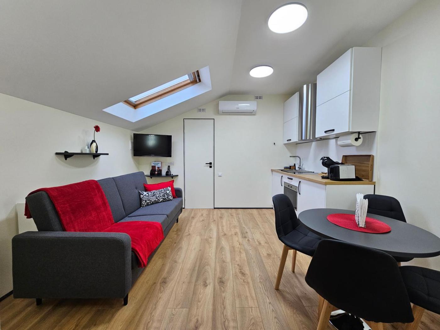 Family Studio. Providing free toiletries, this studio includes a private bathroom with a walk-in shower and a hairdryer. In the kitchenette, guests will find a stovetop, a refrigerator, kitchenware and a microwave. The air-conditioned studio provides a flat-screen TV with streaming services, a private entrance, a coffee machine, a dining area as well as a quiet street view. The unit offers 2 beds. ;
