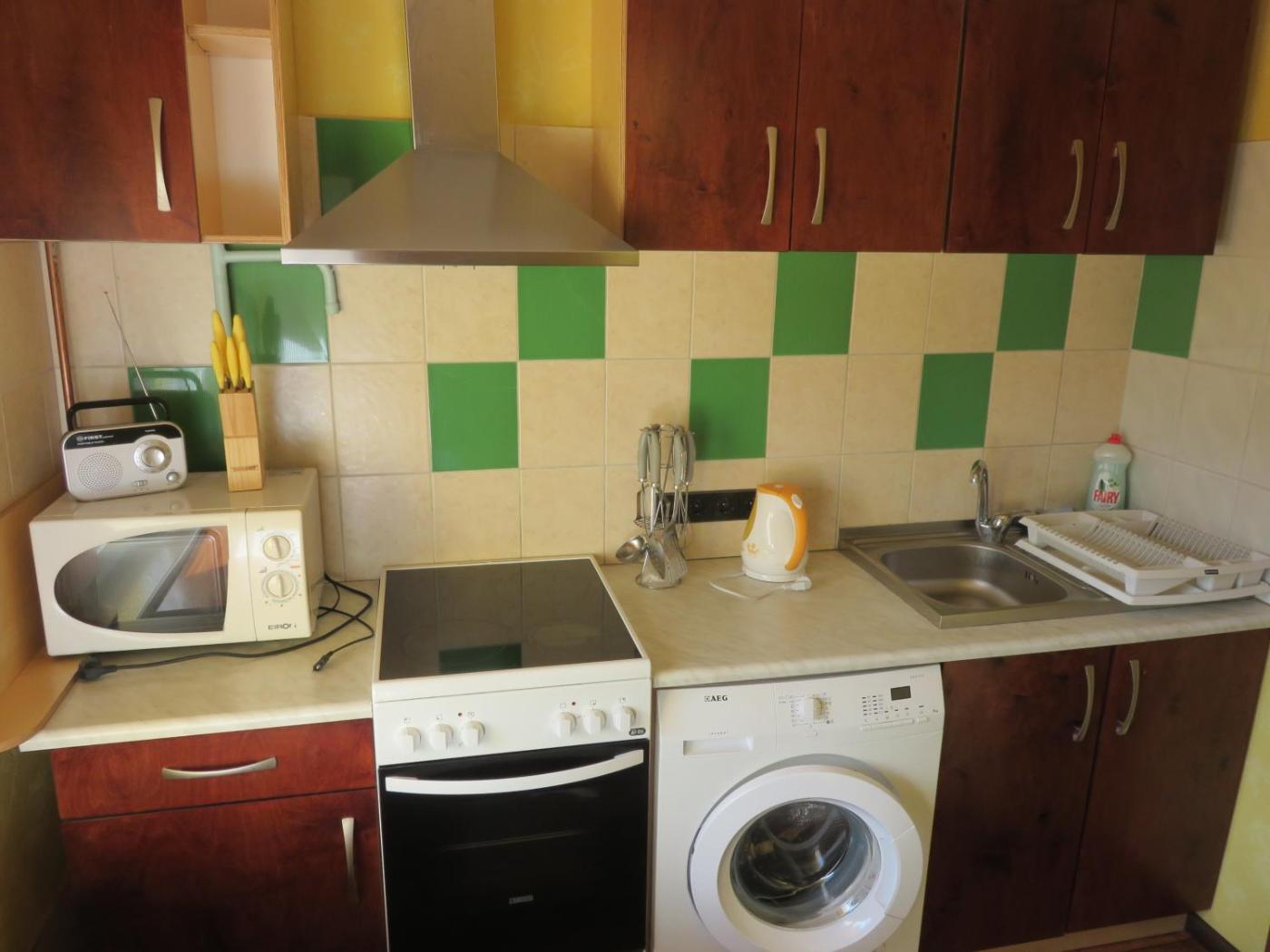 Standard Apartment. The apartment has 1 bedroom, 1 bathroom with a bath and a kitchen. In the kitchen, guests will find a stovetop, a refrigerator, kitchenware and an electric kettle. This apartment features a washing machine, a dining area, a TV with cable channels and a balcony. The unit has 3 beds.
