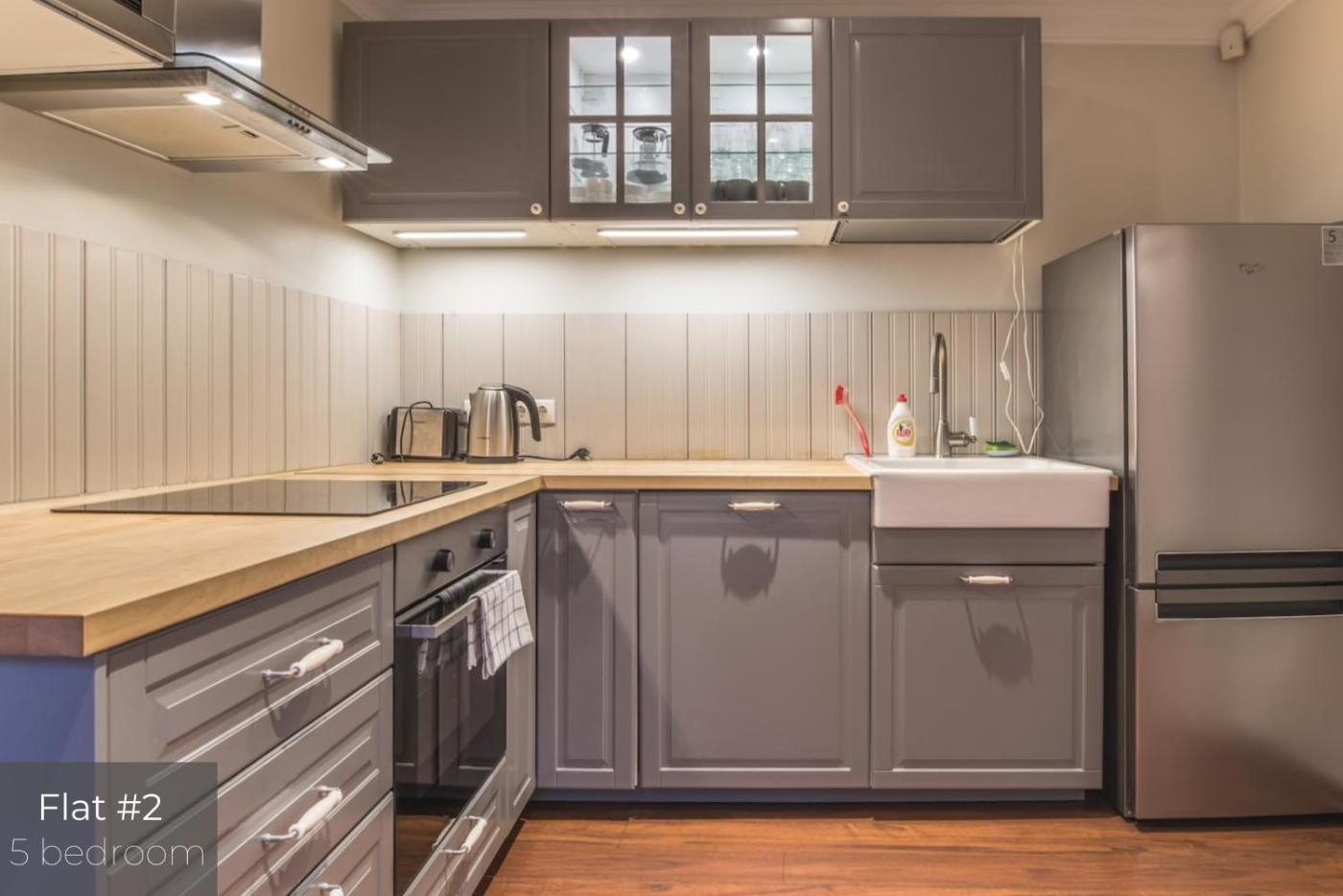 Five-Bedroom Apartment with Terrace Nr. 2. Featuring a private entrance, this air-conditioned apartment consists of 1 living room, 5 separate bedrooms and 2 bathrooms with a bath and a shower. Guests can make meals in the kitchen that is equipped with a stovetop, a refrigerator, a dishwasher and kitchenware. A seating area with a flat-screen TV, a washing machine and a terrace are provided in this spacious apartment. The unit offers 10 beds. ;