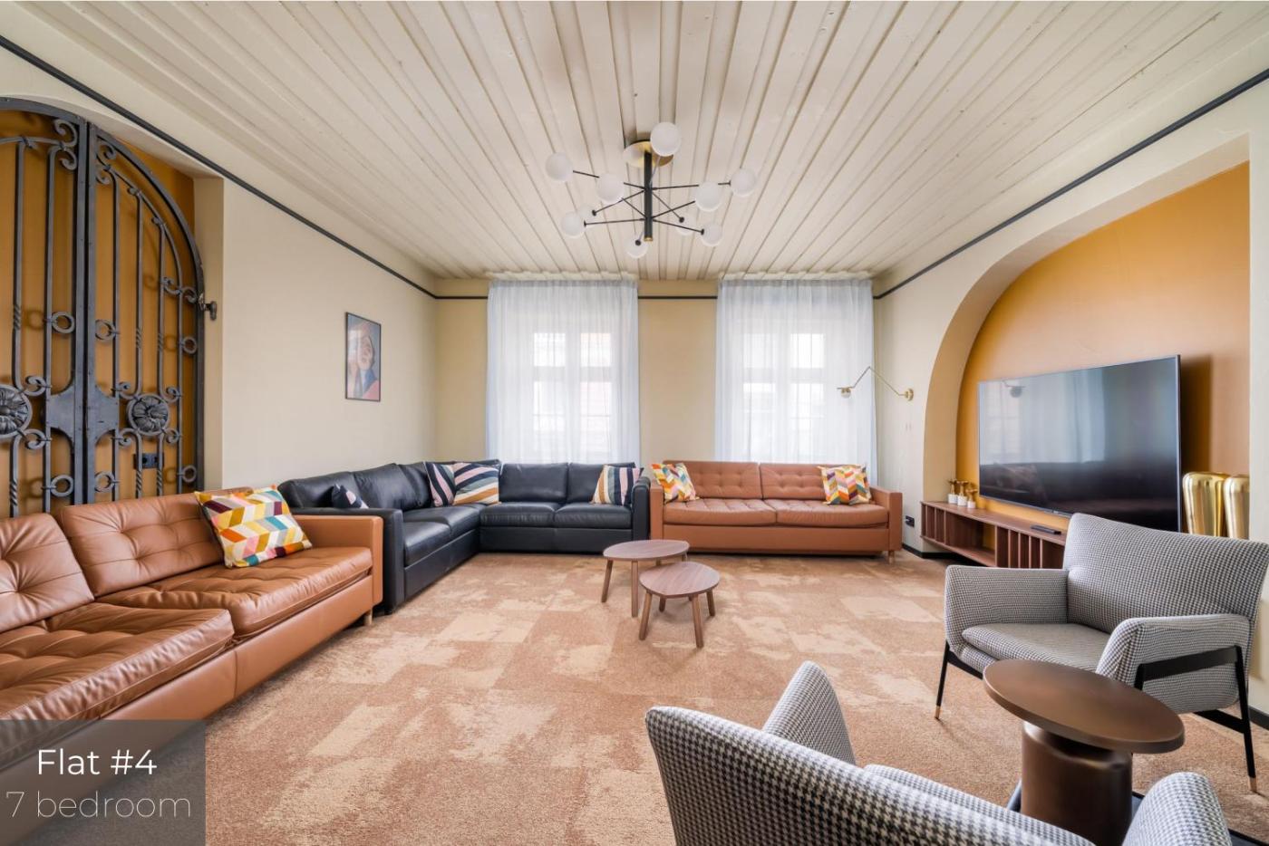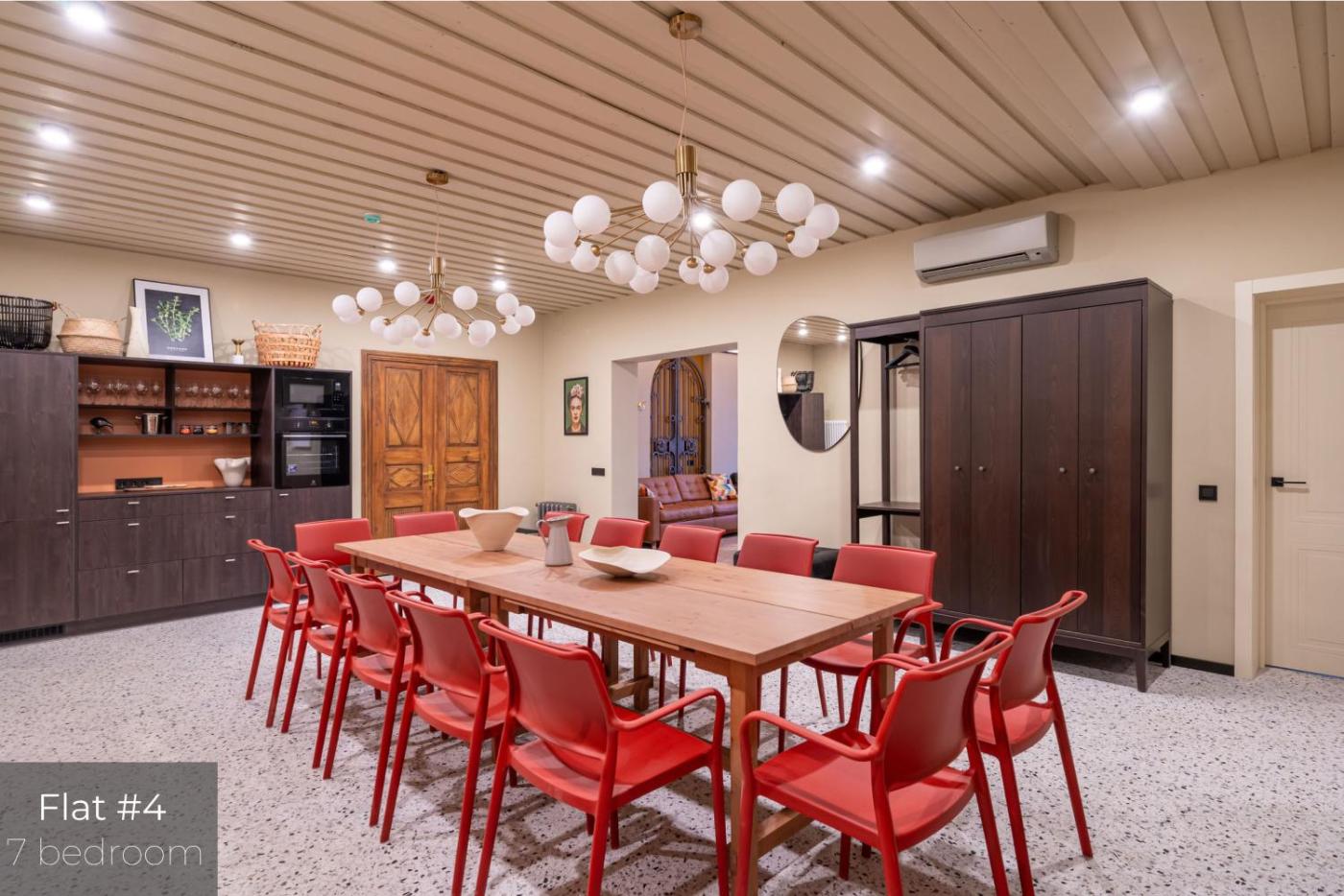 Large Seven-Bedroom Apartment with Sauna and Terrace Nr. 4. This apartments standout features are the hot tub, sauna and fireplace. Boasting a private entrance, this air-conditioned apartment includes 1 living room, 7 separate bedrooms and 4 bathrooms with a bath and a shower. In the well-fitted kitchen, guests will find a stovetop, a refrigerator, a dishwasher and kitchenware. The spacious apartment offers a washing machine, a tea and coffee maker, a seating area as well as a terrace with city views. The unit has 17 beds. ;