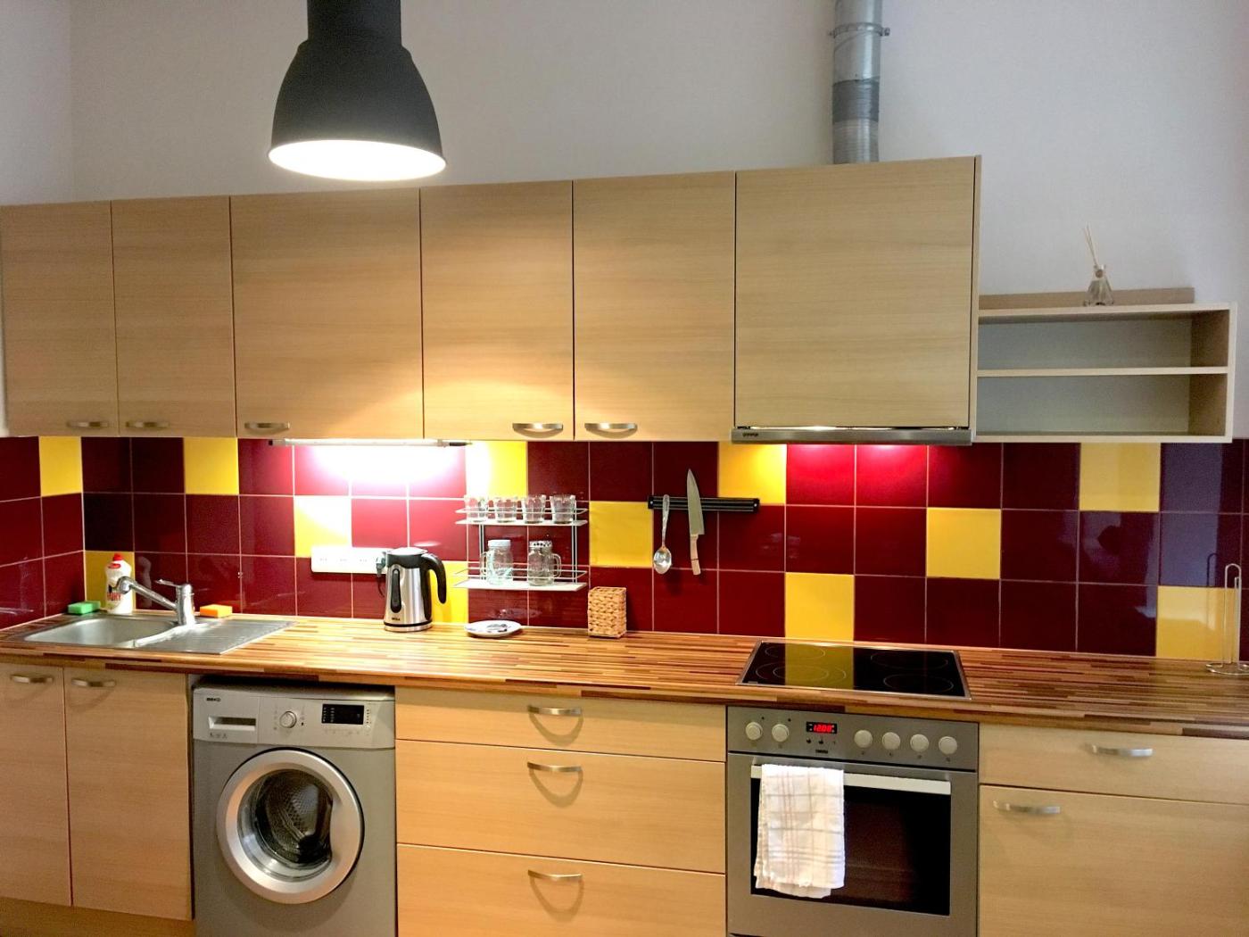 One-Bedroom Apartment. This apartment features a stovetop, a washing machine and kitchenware. There is a living room with a sofa bed and is combined with the kitchen. Linen and towels are offered.