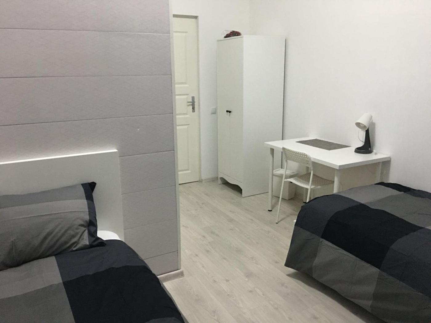 Twin Room with Bathroom. The twin room features a washing machine, a wardrobe, as well as a private bathroom boasting a shower and a hairdryer. The twin rooms kitchenette is available for cooking and storing food. The twin room has parquet floors and provides tumble dryer, heating and city views. The unit has 2 beds. ;