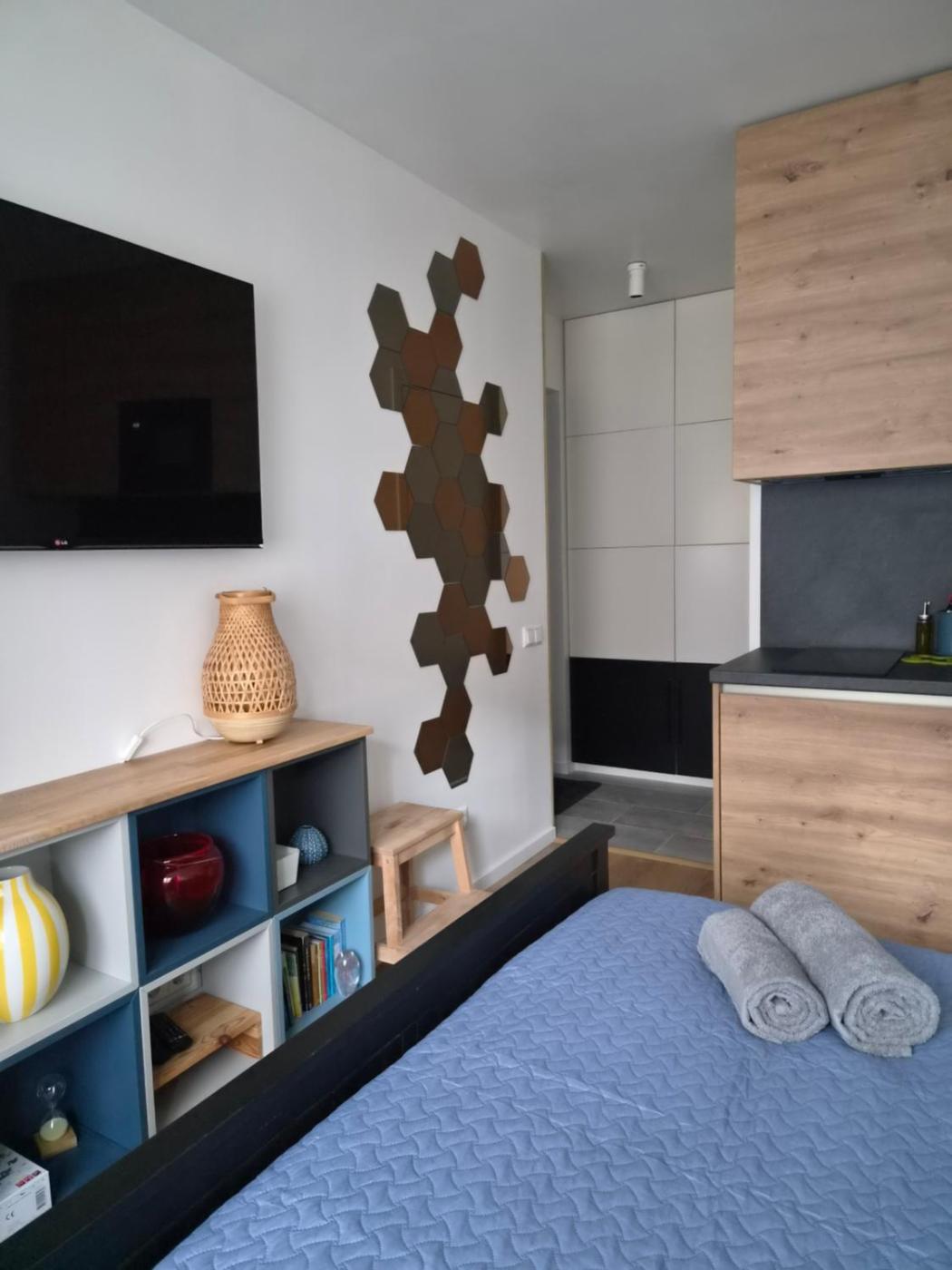 One-Bedroom Apartment. The apartment has 1 bedroom and 1 bathroom with a shower and free toiletries. Guests can make meals in the kitchenette that has a stovetop, a refrigerator, kitchenware and a microwave. The apartment offers a tea and coffee maker, a wardrobe, a tiled floor, a flat-screen TV, as well as ancourtyard view. The unit has 1 bed.