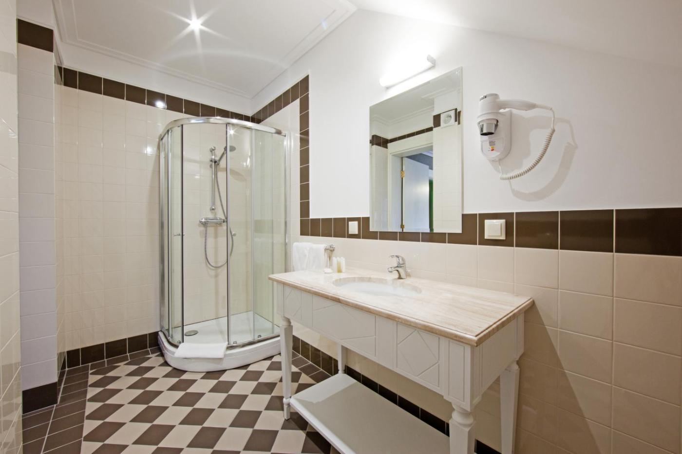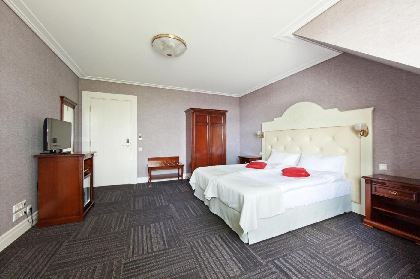 Suite. A very spacious suite decorated in classical style, with wooden furniture. It has a flat-screen TV with satellite channels and a large seating area with a sofa. Bathroom has a large bathtub, a bidet and free toiletries. Extras include a minibar and a safety deposit box. There is a view of the manor park from the window. ;